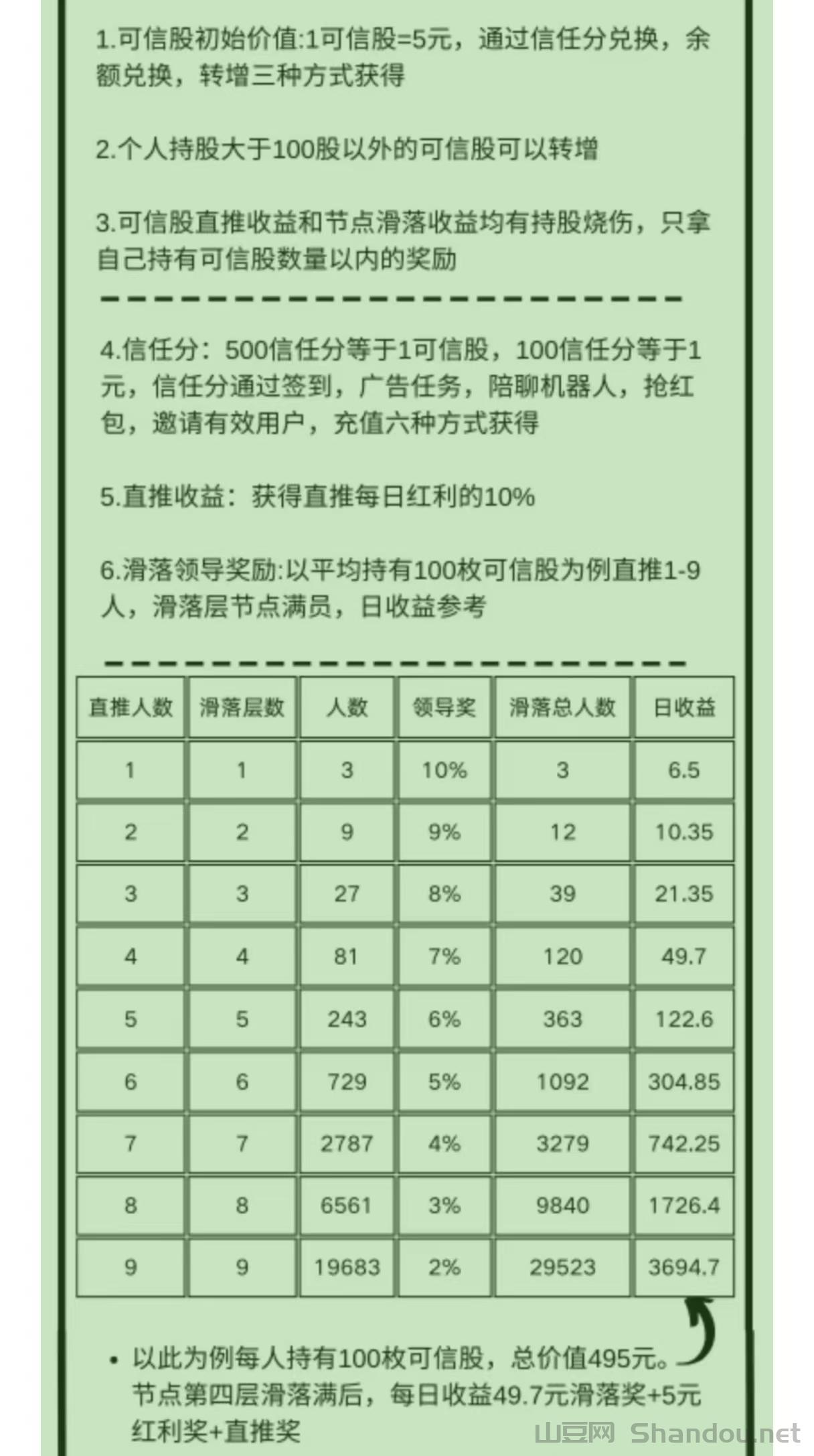 ②用户冲10圆成为有效会员,即可享受9袋滑落奖励+团队加成,抢占滑落位置,开启财富之路。