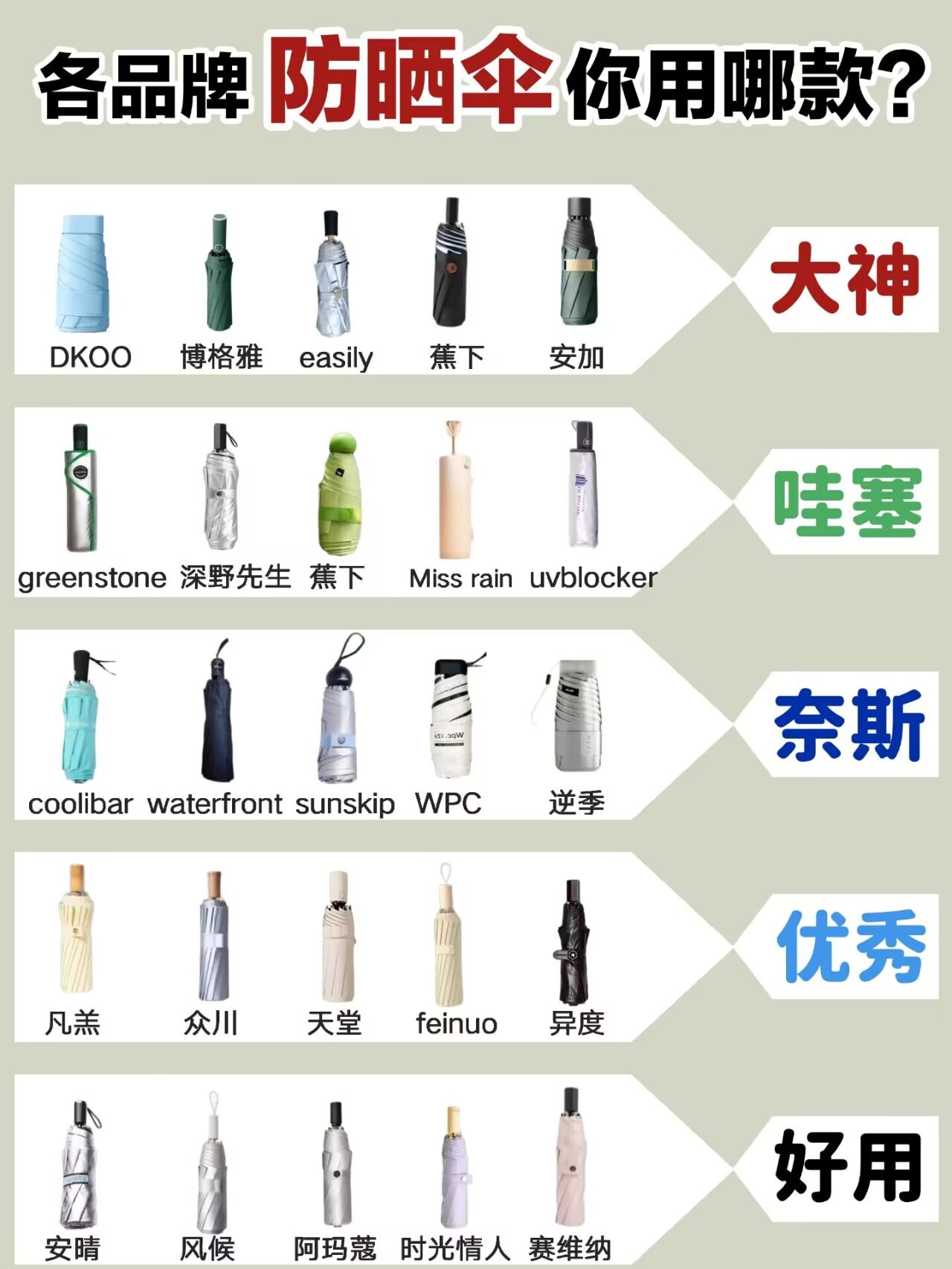 十大公认好用的防晒伞品牌包括:天堂伞、蕉下Beneunder、红叶伞HongYe、梅花伞SUSINO、太阳城SUNCITY、W.P.C、海螺伞Hailuo、BLACKLEMON黑柠檬、菲诺伞业FEINUO以及Fulton富尔顿。