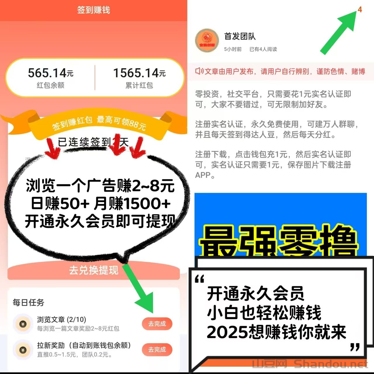 静态收入玩法:开通永久会员,每天签到和浏览10个广告,日赚50元,月赚最低1500元。