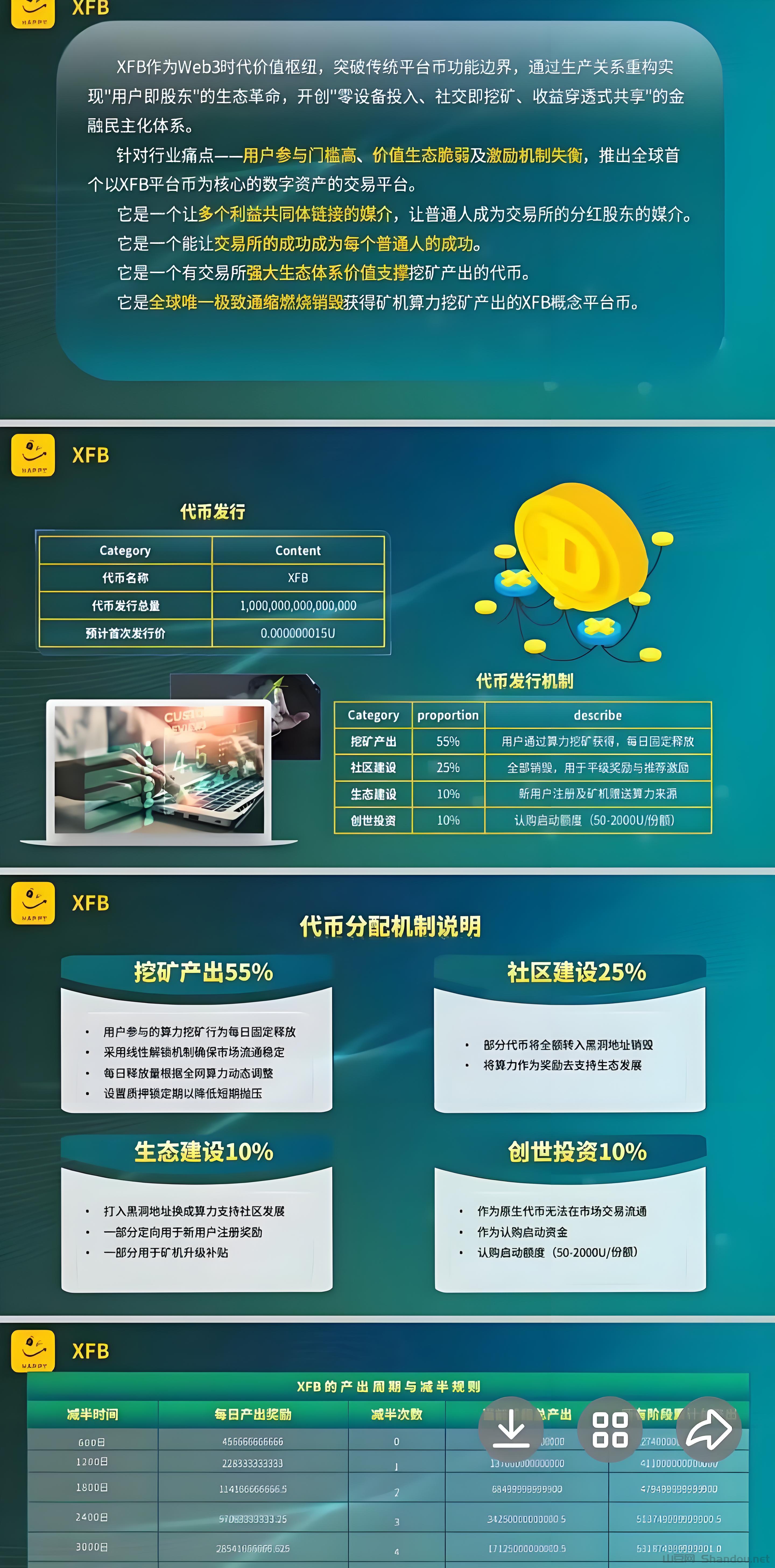 XFB交易手续费20%自动销毁,广告营销50%买盘销毁。现货交易50%手续费用于销毁,上币费40%投入销毁池。游戏收入全部拉盘销毁,获取算力的代币100%销毁。