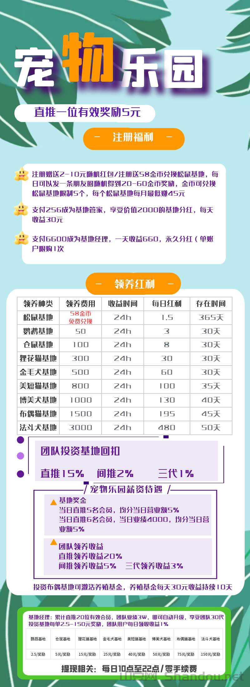 累计直推20位有效会员,团队业绩3W,即可自动升级,享受团队30代投资基地每单2.5-150元奖励,团队用户每日领取收益1%!