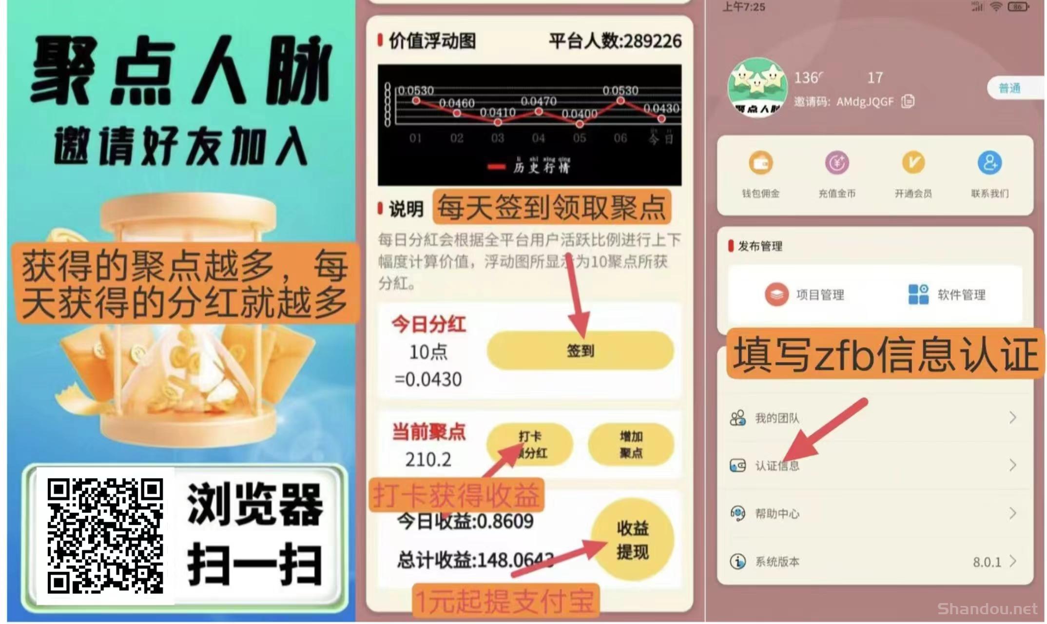 零撸每日签到获得聚点、根据聚点数量每日打卡领分紅,1元起提zfb